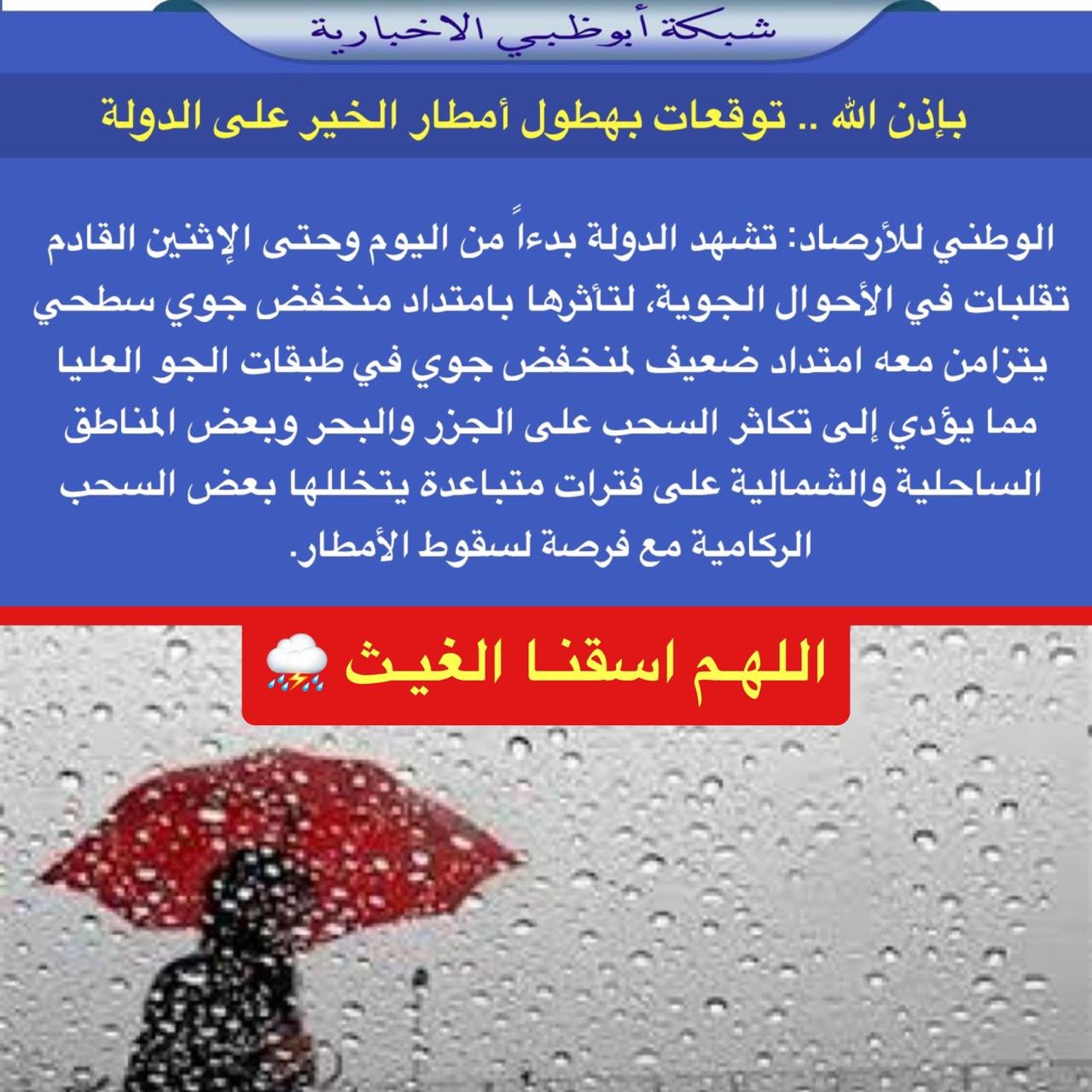 شبكة أبوظبي On Twitter الوطني للأرصاد تشهد الدولة بدءا من اليوم وحتى الإثنين القادم تقلبات في الأحوال الجوية لتأثرها بامتداد منخفض جوي سطحي يتزامن معه امتداد ضعيف لمنخفض جوي في طبقات