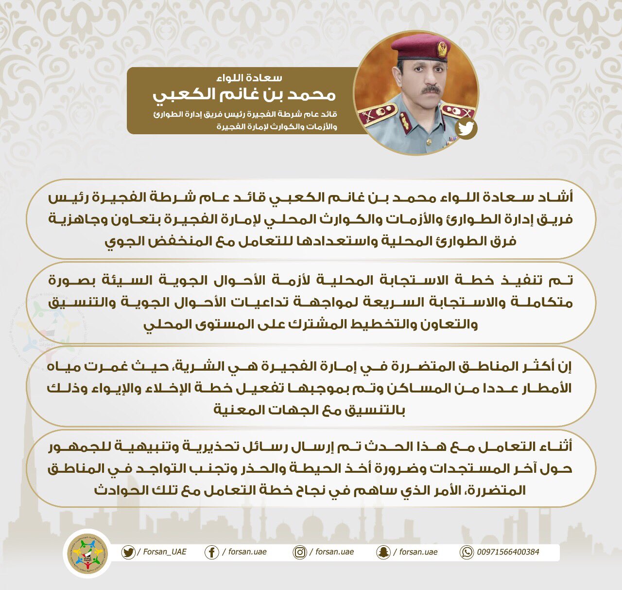فرسان الإمارات Pa Twitter أشاد سعادة اللواء محمد بن غانم الكعبي قائد عام شرطة الفجيرة رئيس فريق إدارة الطوارئ والأزمات والكوارث المحلي لإمارة الفجيرة بتعاون وجاهزية فرق الطوارئ المحلية واستعدادها للتعامل مع المنخفض