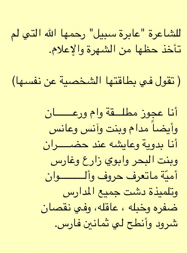 أحمد المطيري On Twitter انا عجوز مطلقة وام ورعان وايضا مدام وبنت وانس وعانس انا بدوية وعايشه عند حضران وبنت البحر وابوي زارع وغارس عابرة سبيل ابيات وحدة وطنية