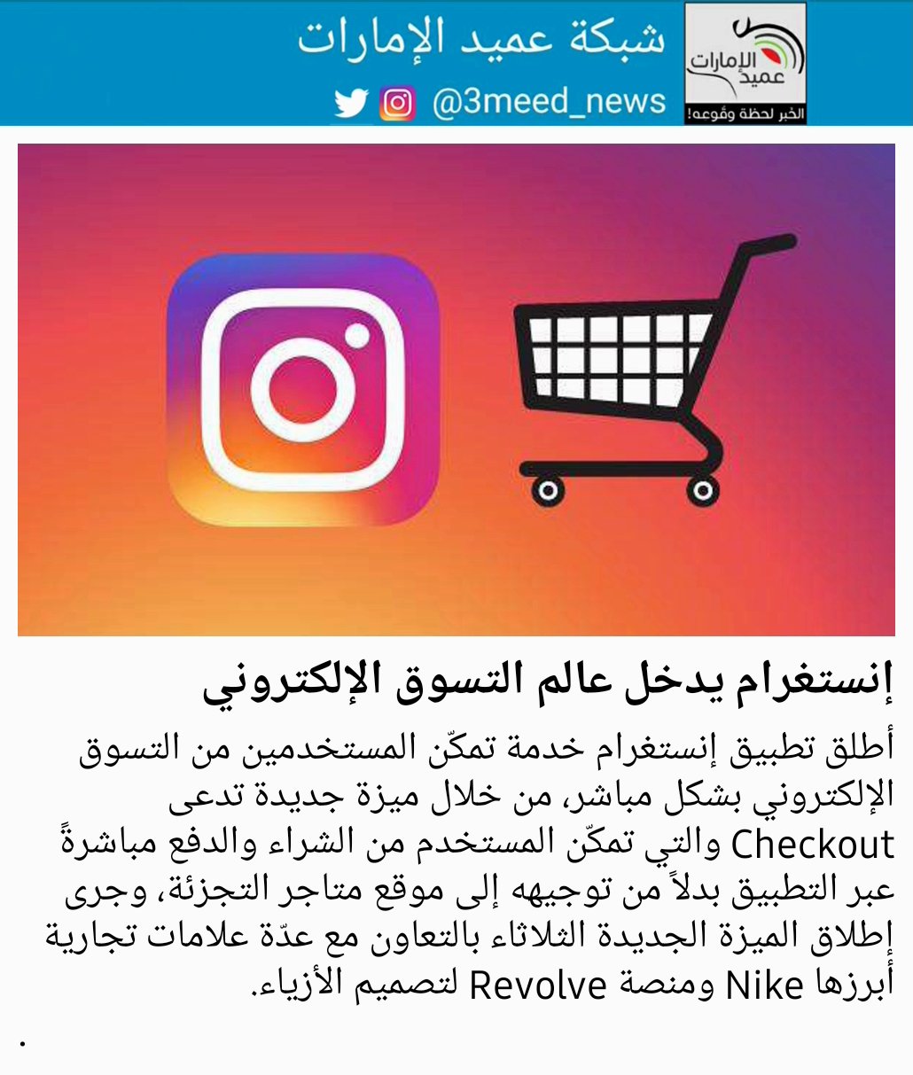 شبكة عميد الإمارات בטוויטר أطلق تطبيق إنستغرام خدمة تمك ن المستخدمين من التسوق الإلكتروني بشكل مباشر من خلال ميزة جديدة تدعى Checkout والتي تمك ن المستخدم من الشراء والدفع مباشرة عبر التطبيق بدلا من