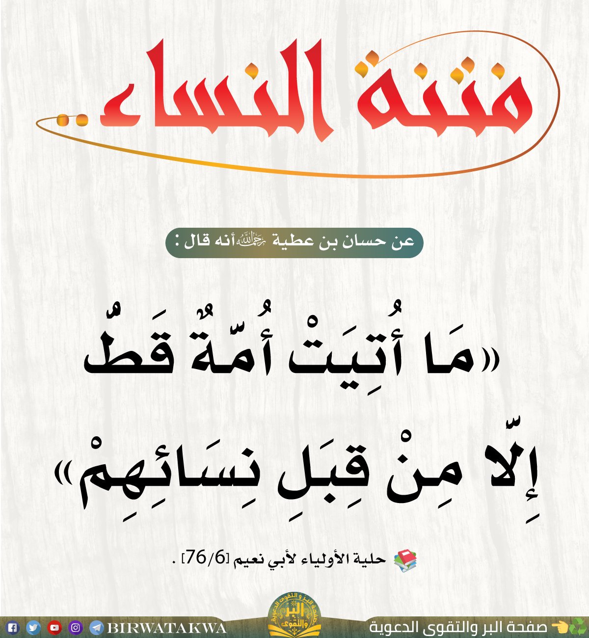 البر و التقوى على تويتر فتنة النساء عن حسان بن عطية أنه قال م ا أ ت ي ت أ م ة ق ط إ ل ا م ن ق ب ل ن س ائ ه م حلية الأولياء لأبي نعيم ٦ ٧٦ Https T Co D4eajukwzj